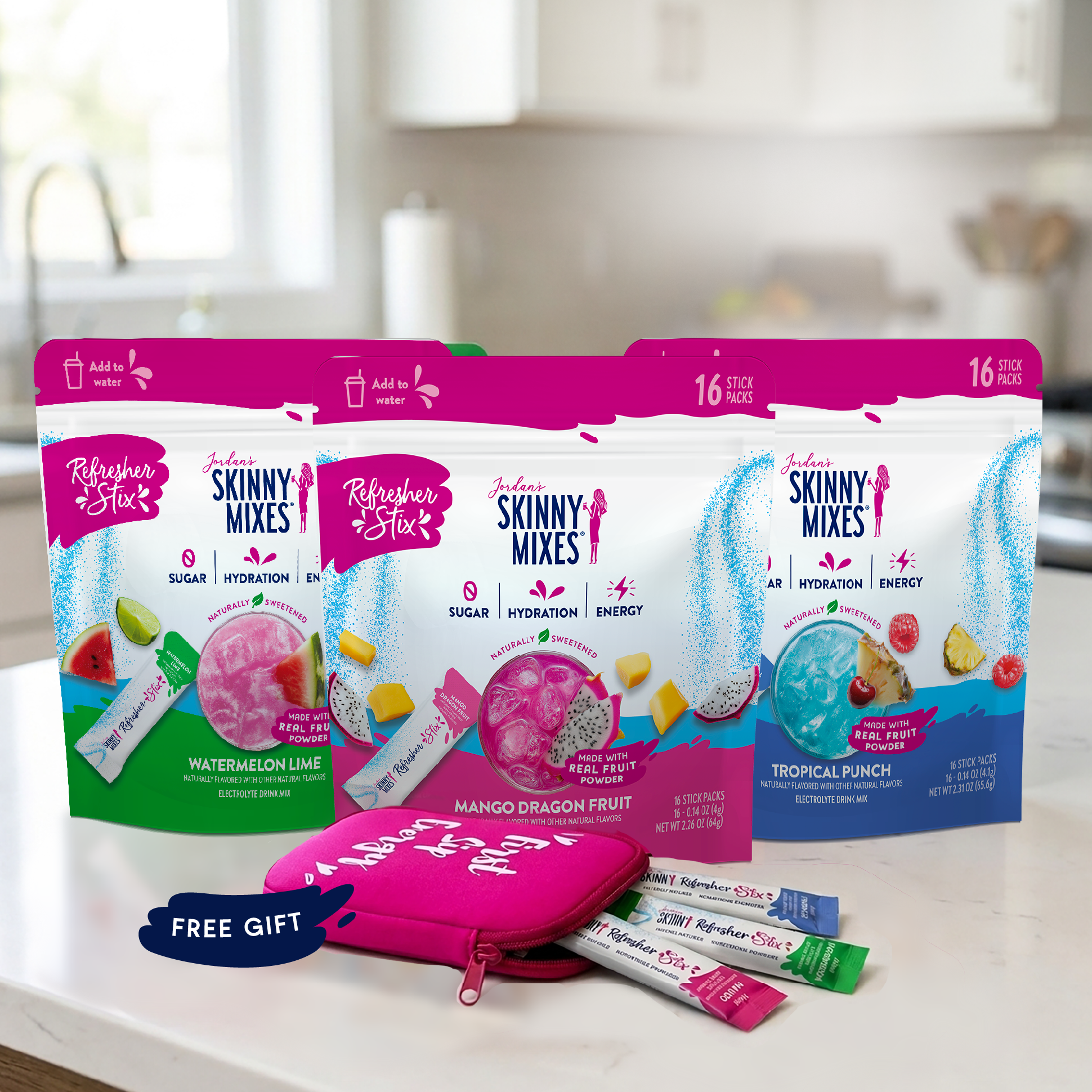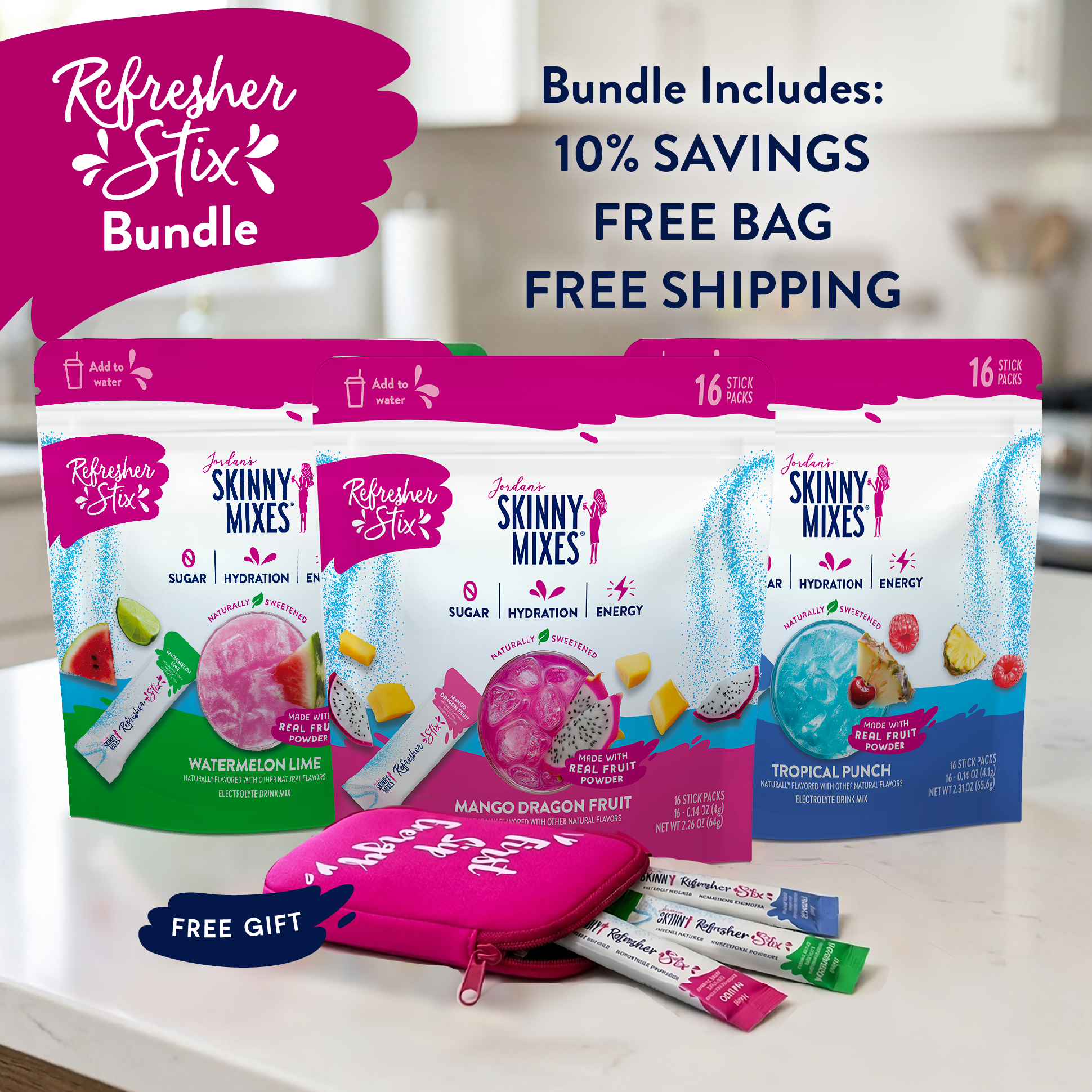 48 Refresher Stix to hydrate, energize & refresh — plus a FREE Pouch & FREE Shipping. The best way to ditch boring water.