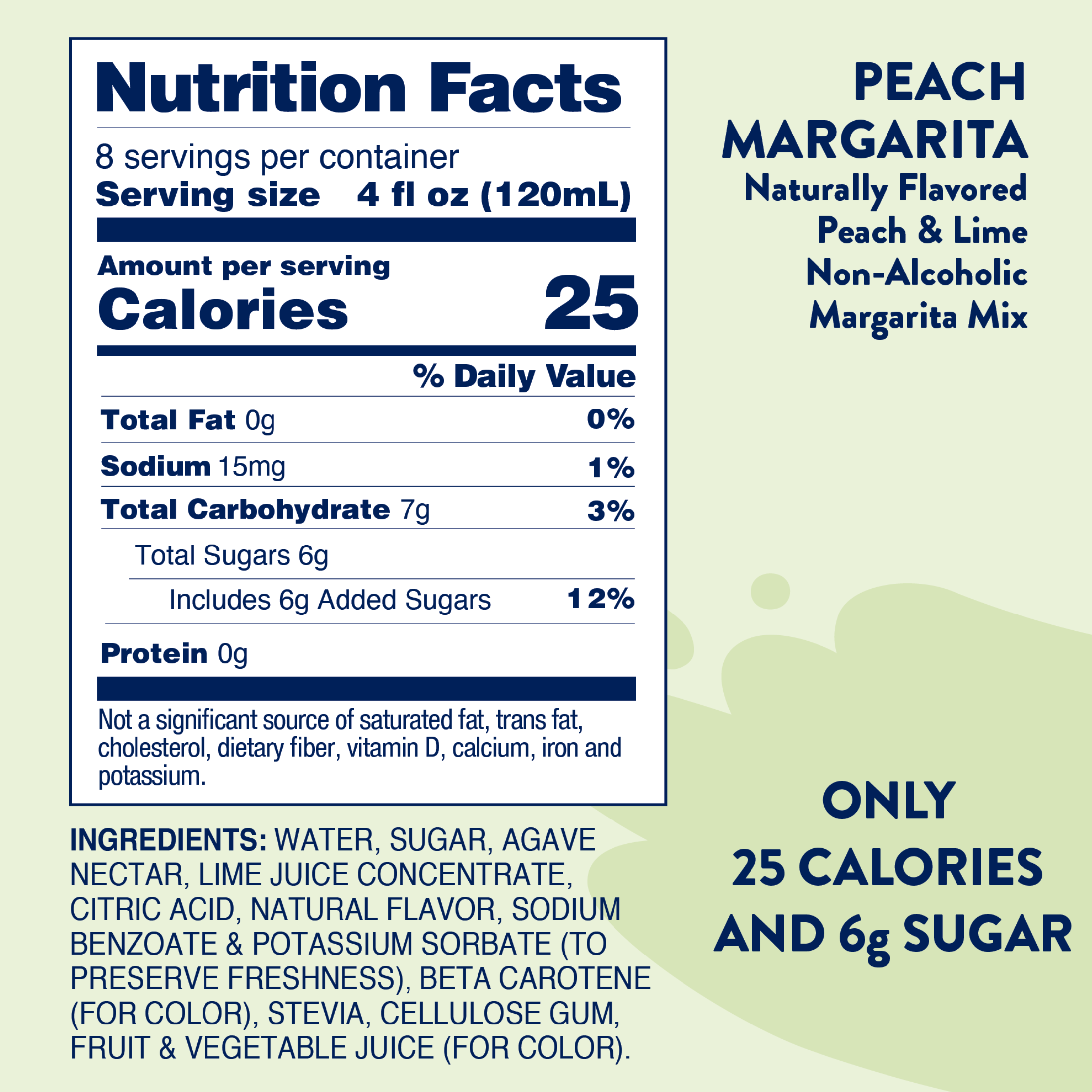 Our Natural Peach Margarita Mix uses the rich and luscious flavor of juicy peaches with the flawlessly tart flavor of fresh limes and a pinch of salt. It is lightly sweetened with agave nectar, stevia and just a hint of pure cane sugar for a perfectly balanced sweet and savory peach margarita mix.