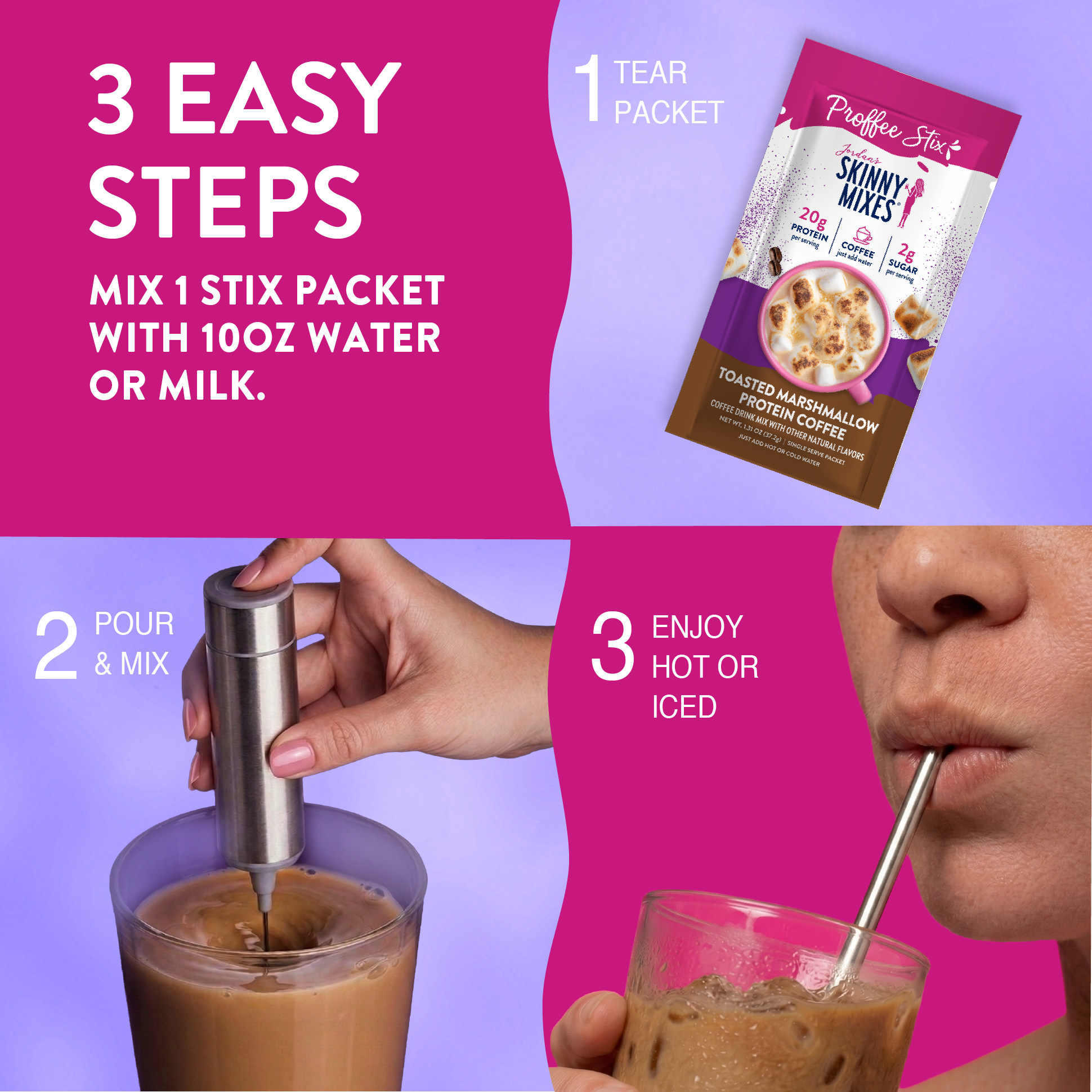 No blender. No brewing. No equipment. Proffee STIX works hot or cold — making it the most portable protein coffee on the planet.