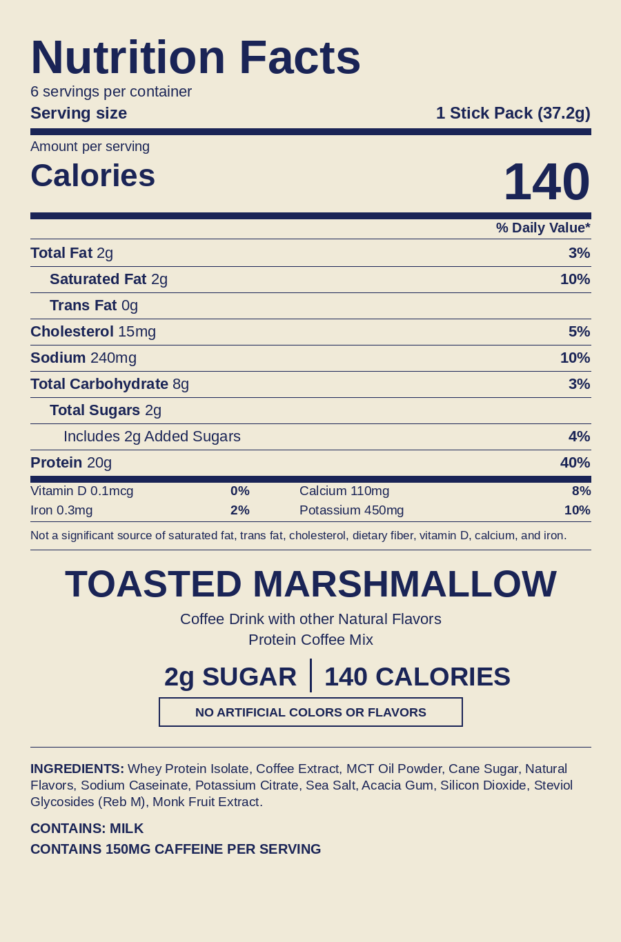 Whey Protein Isolate, Coffee Extract, MCT Oil Powder, Cane Sugar, Natural Flavors, Sodium Caseinate, Potassium Citrate, Sea Salt, Acacia Gum, Silicon Dioxide, Steviol Glycosides (Reb M), Monk Fruit Extract