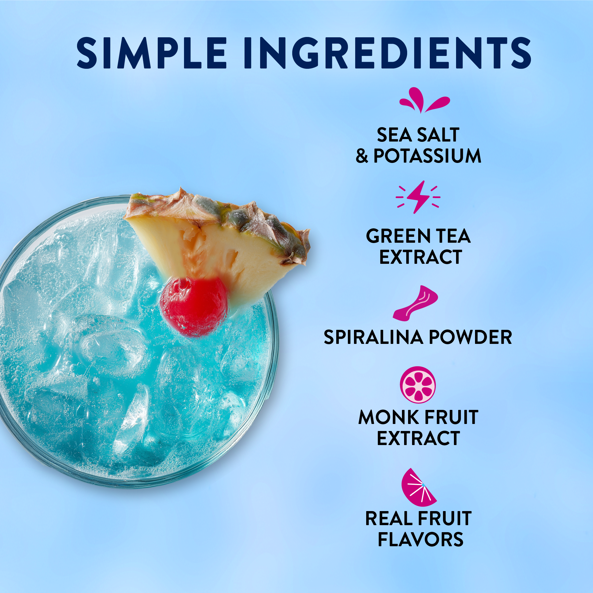 Citric Acid, Potassium Citrate, Natural Flavors, Cherry Juice Powder, Sea Salt, Pineapple Juice Powder, Spirulina Powder (Color), Steviol Glycosides (Reb M), Caffeine (from Green Tea Extract), Silicon Dioxide, Raspberry Juice Powder, Monk Fruit Extract.