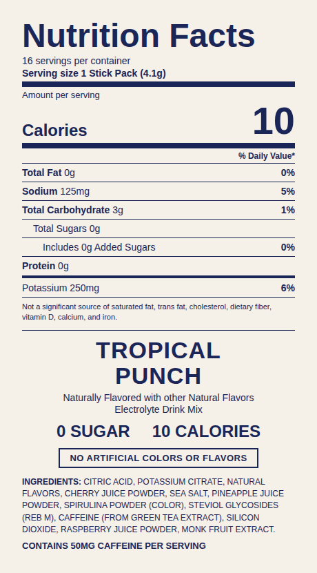 No artificial colors, flavors, or sweeteners — period. Naturally sweetened with Monk Fruit and Stevia, powered by real cherry, pineapple, and raspberry juice powder. We put the ingredient list right here because we're proud of every single one. Includes Potassium Citrate to support hydration. Contains 50mg caffeine from green tea extract for a natural energy boost. Every ingredient earns its place.