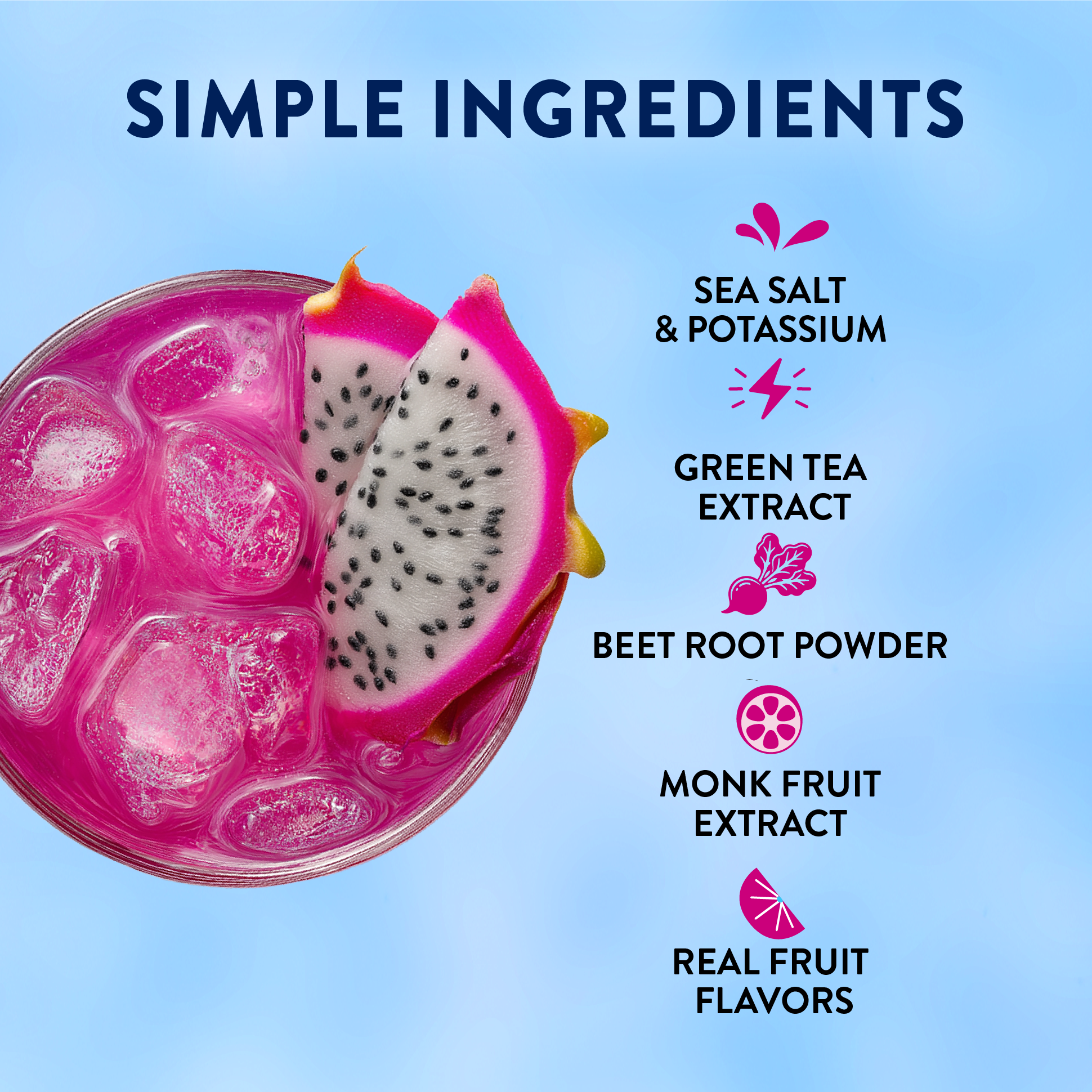 Citric Acid, Potassium Citrate, Natural Flavors, Dragon Fruit Powder, Sea Salt, Mango Fruit Powder, Caffeine (from Green Tea Extract), Steviol Glycosides (Reb M), Silicon Dioxide, Monk Fruit Extract.