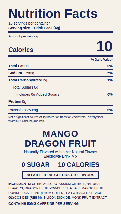 No artificial colors, flavors, or sweeteners — period. Naturally sweetened with Monk Fruit and Stevia, powered by real dragon fruit and mango fruit powder. We put the ingredient list right here because we're proud of every single one. Includes Potassium Citrate to support hydration. Contains 50mg caffeine from green tea extract for a natural energy boost. Every ingredient earns its place.