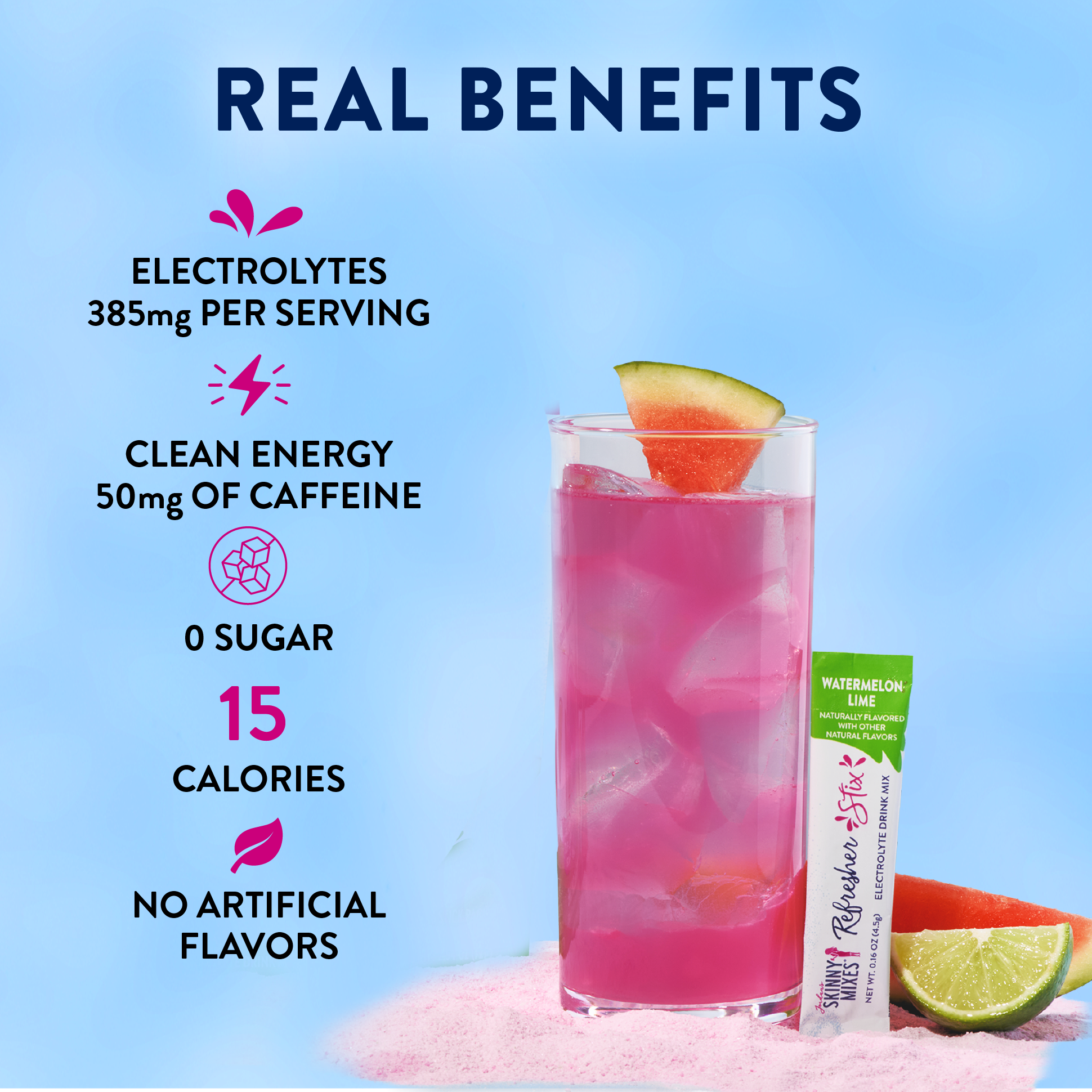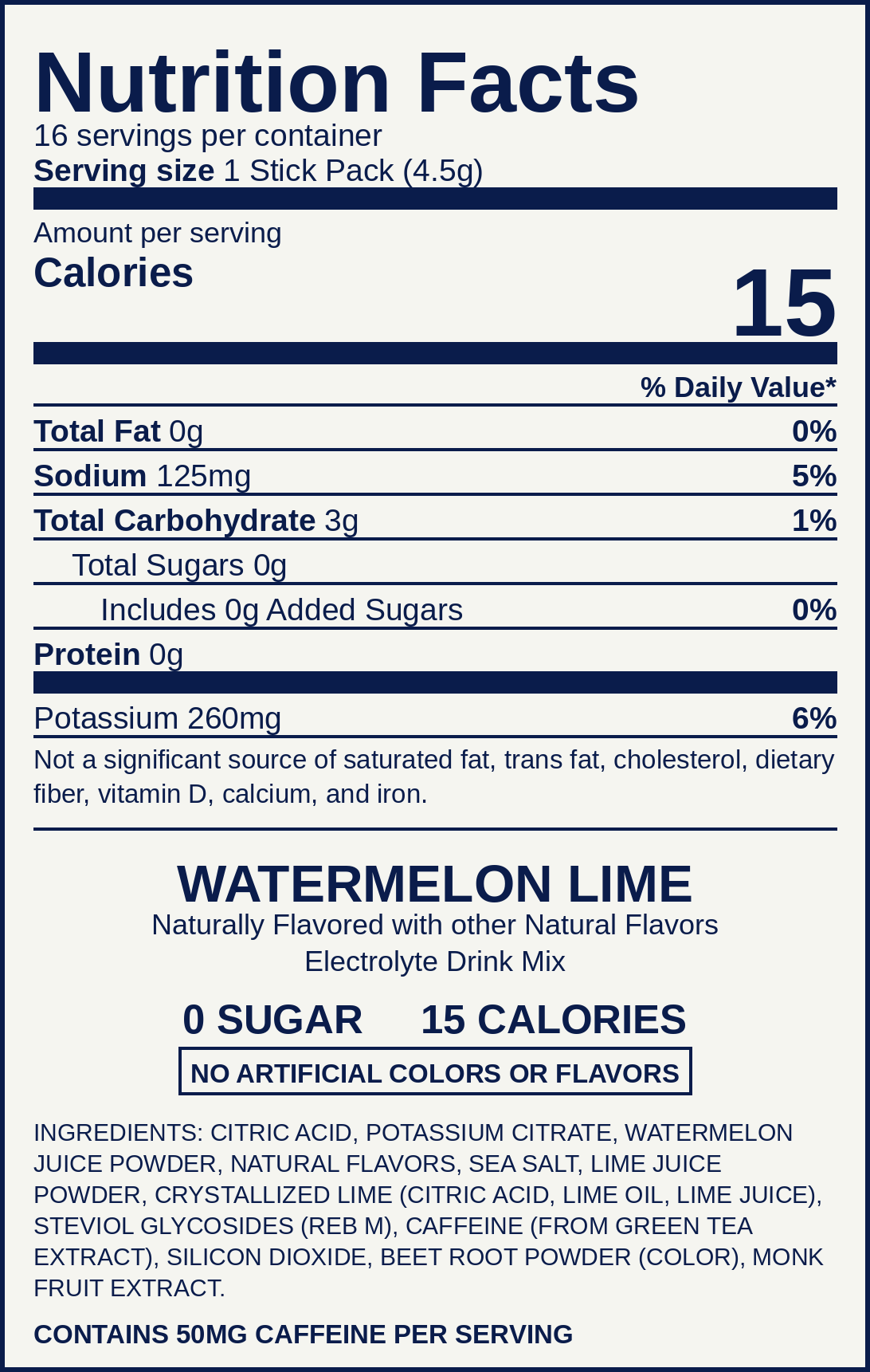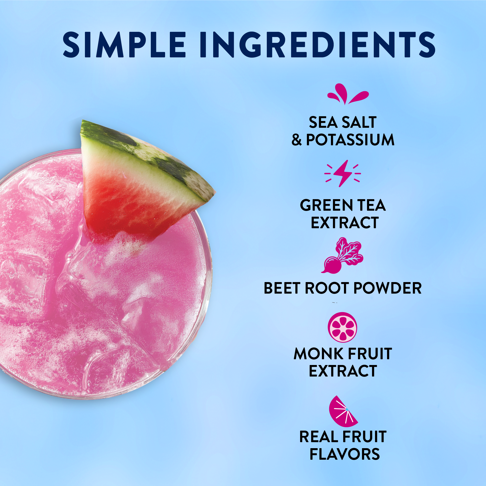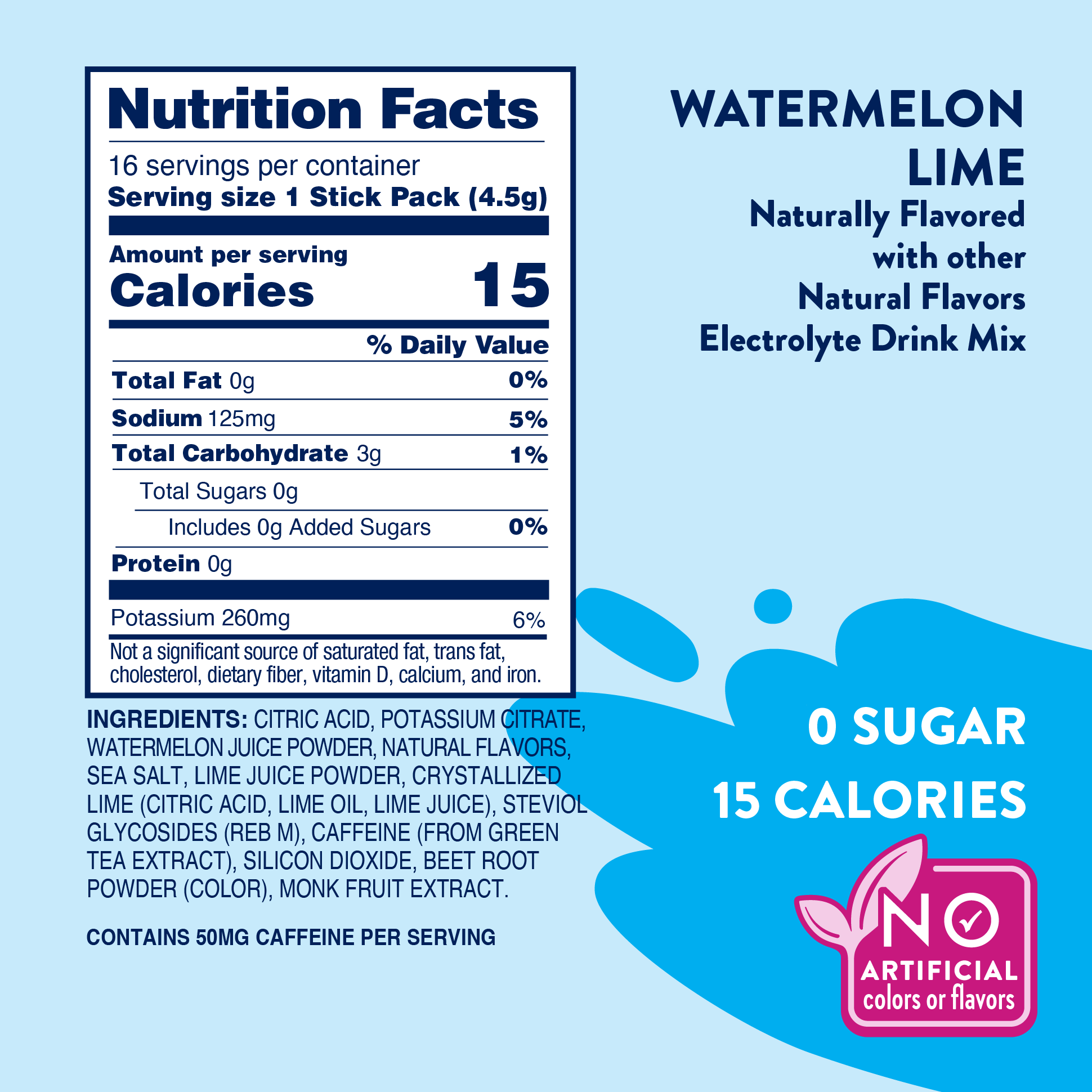 Citric Acid, Potassium Citrate, Watermelon Juice Powder, Natural Flavors, Sea Salt, Lime Juice Powder, Crystallized Lime (Citric Acid, Lime Oil, Lime Juice), Steviol Glycosides (Reb M), Caffeine (from Green Tea Extract), Silicon Dioxide, Beet Root Powder (Color), Monk Fruit Extract.