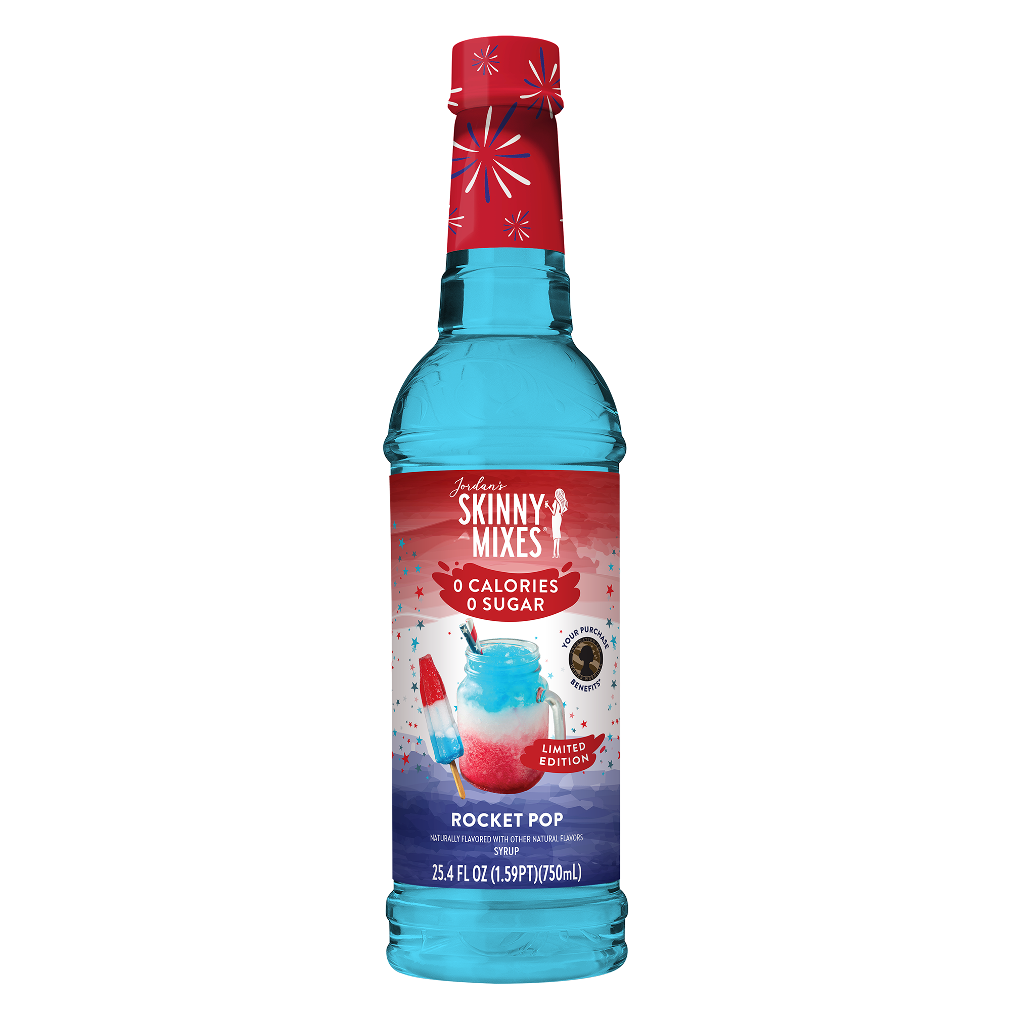- In a blender, combine the ice cubes, cold water, and Jordan's Skinny Mixes Sugar Free Rocket Pop Syrup.