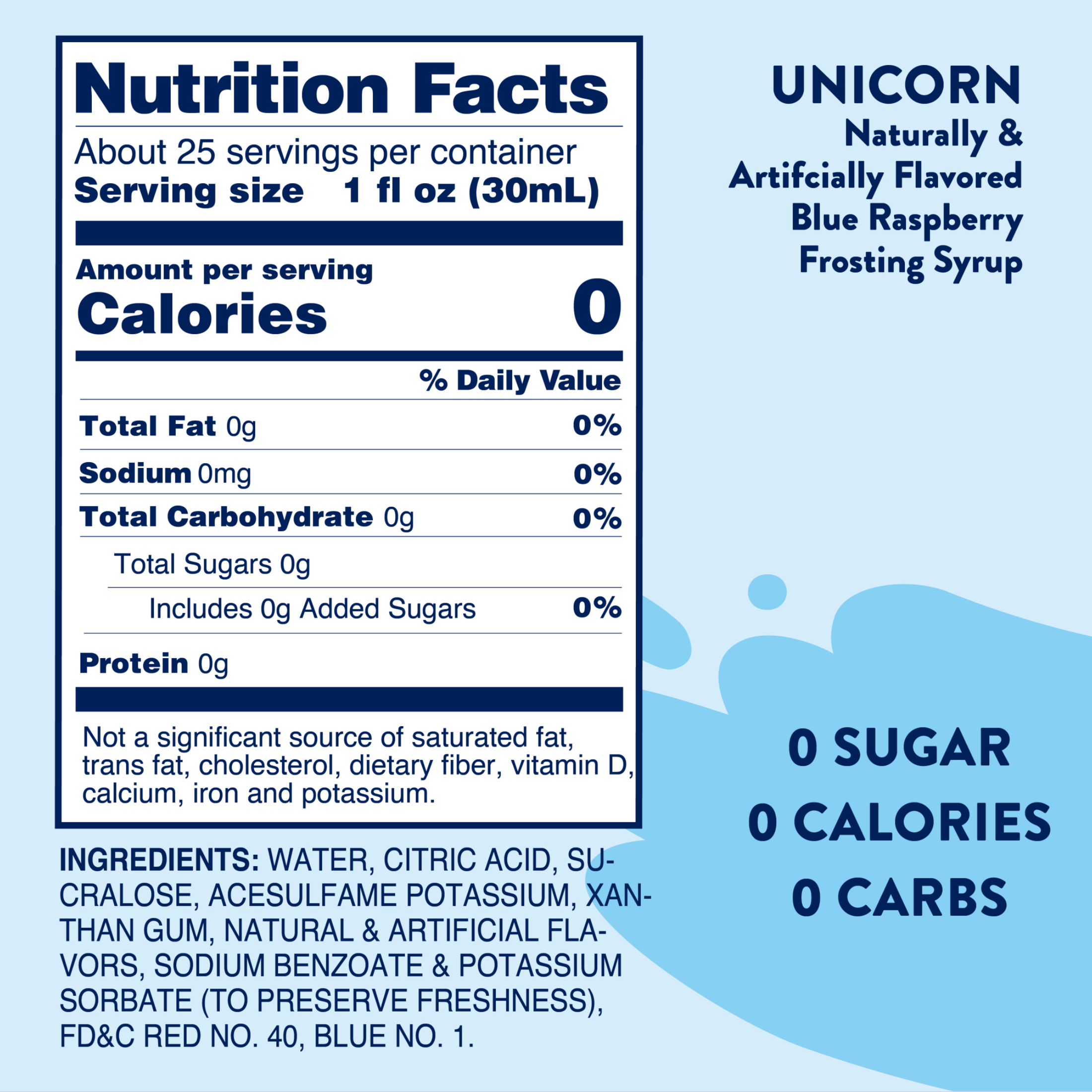 0 sugar, 0 calorie, 0 carb blue raspberry frosting flavored syrup.