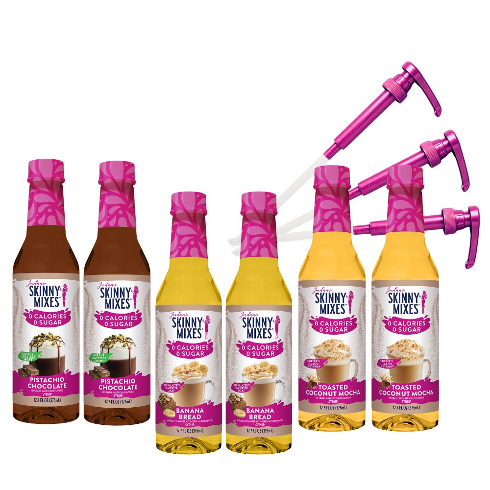 This playful pack includes six 375mL syrups—two each of Sugar Free Banana Bread, Sugar Free Pistachio Chocolate, and Sugar Toasted Coconut Mocha—plus three mini pumps perfect for those 375mL mini bottles.